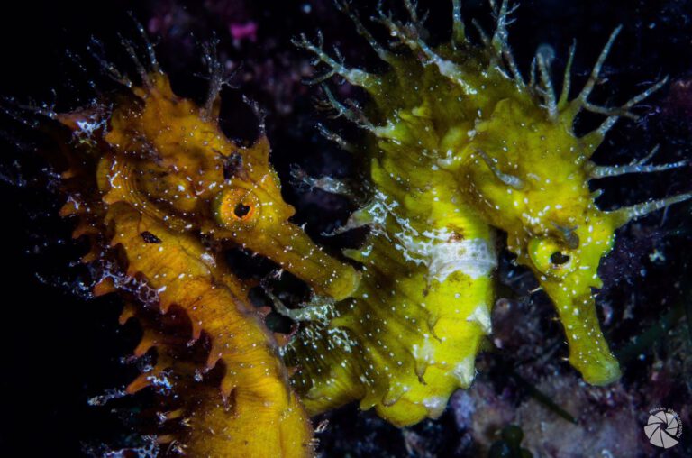 Hippocampus guttulatus es una especie de pez de la familia Syngnathidae. Es una de las especies de caballito de mar presentes en Europa y el mar Mediterráneo. Su nombre común es Caballito de mar. En la primera imagen, observamos a dos ejemplares de esta especie. A la derecha, de color amarillo, tenemos a la hembra, y de color anaranjado